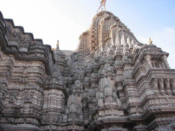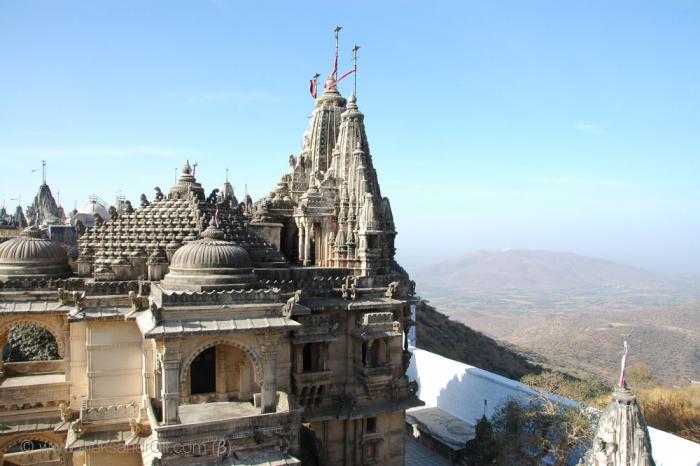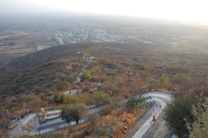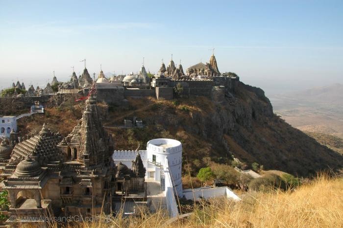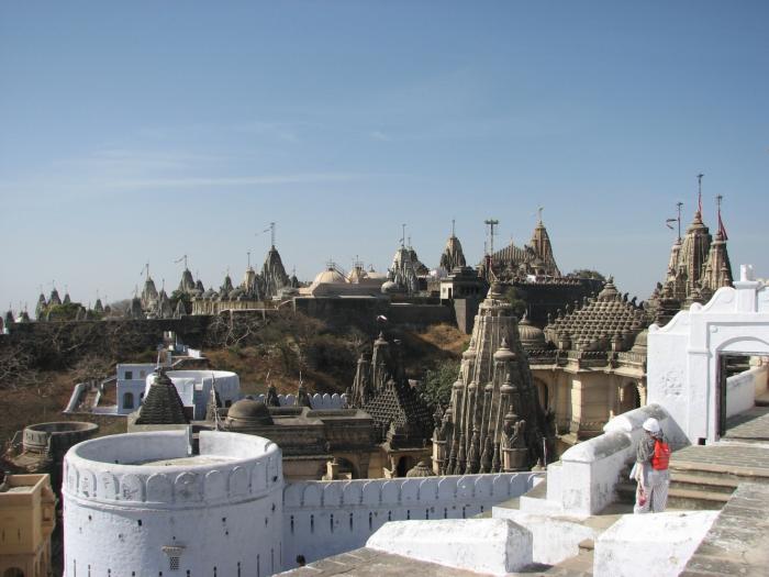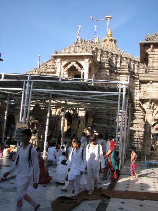 Святыня Джайнов – г. Шатрунджаи, на которой расположено чуть более 800 храмов, и ведет туда 2300-2400 ступеней. Очень-очень рано утром (дабы попытаться встретить рассвет на горе) мы поднялись и по утреней свежести двинулись в путь. До рассвета все равно не успели. Наблюдали солнце на подъеме. Очень много индийских паломников, много студентов, хорошо одетых индийских девушек и женщин в нарядных сари, с золотыми украшениями. Там есть интересная услуга – за 20 у.е. занесут на носилках наверх. Носят либо как махараджу – человек сидит, 4 несут, либо на один шест делают качельки и 2 несут. Причем есть носильщики женщины. Наблюдала как 4 довольно изящные девушки несли восседающую индоутку. Наверное, может религия не позволяет чтобы мужчины близко находились. На гору несется куча всякой поклажи – дрова, орехи, цветы, рис – для подношений.